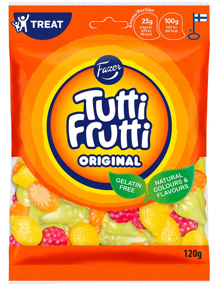Tutti Frutti дарує веселощі! Tutti Frutti Original – це веселий асортимент цукерок із фруктовими смаками: малини, груші, лимона та унікального Tutti Frutti. Ці оригінальні фруктові цукерки виготовлені з натуральних барвників, не містять желатину та є веганськими. Свіжий смак вони отримують завдяки натуральним ароматизаторам. Насолоджуйтесь пакетиком цукерок самі або побалуйте друзів фруктовим сюрпризом!