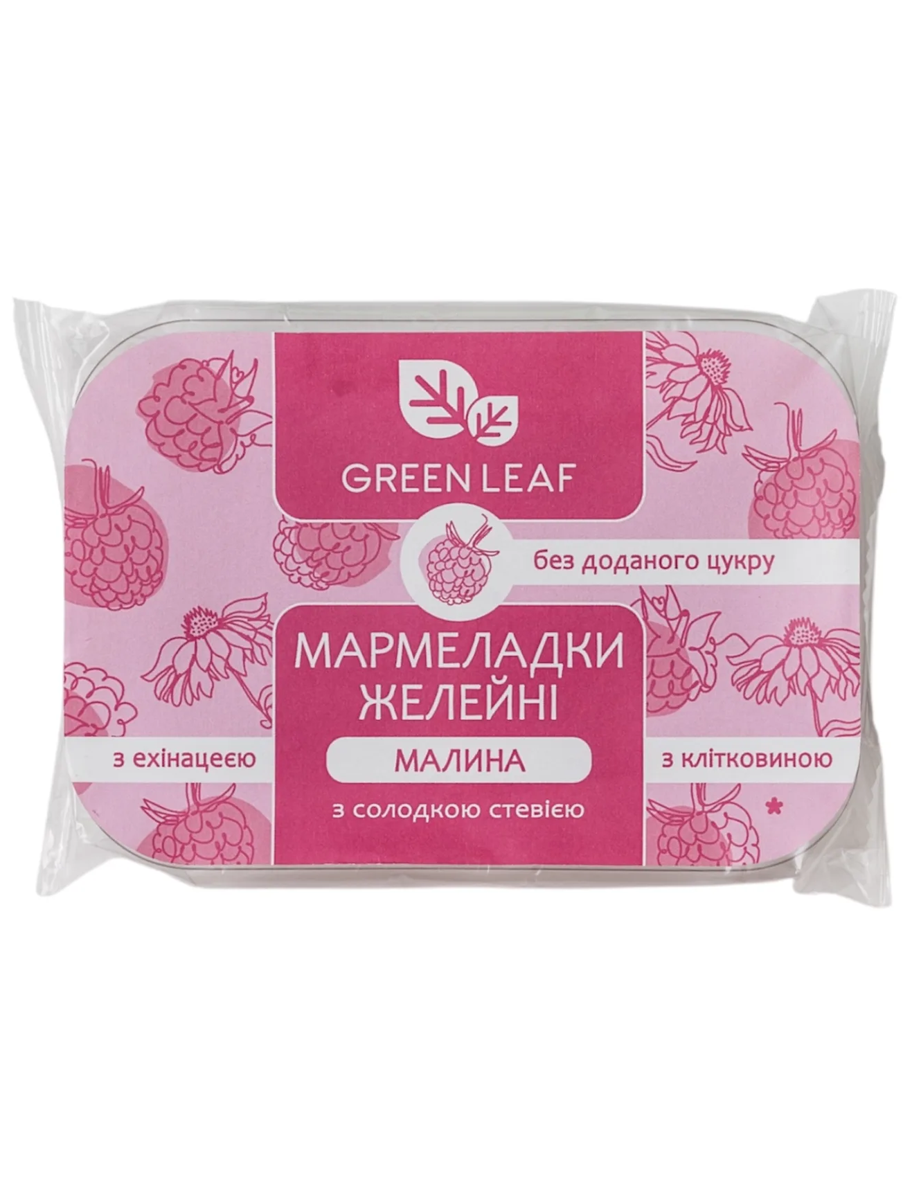 Склад: патока глюкозна, вода підготовлена очищена, натуральні підсолоджувачі (алюлоза, солодка стевія GREEN LEAF), желюючий агент желатин, сік концентрований малиновий 4%, сік концентрований яблучний, регулятор кислотності кислота лимонна, клітковина з цитрусу, клітковина акації, натуральний ароматизатор, барвник кармін, антиоксидант кислота аскорбінова, екстракт ехінацеї.