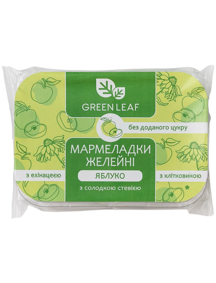 Склад: патока глюкозна, вода підготовлена очищена, натуральні підсолоджувачі (алюлоза, солодка стевія GREEN LEAF), сік концентрований яблучний 9%, желюючий агент желатин, регулятор кислотності кислота лимонна, клітковина з цитрусу, клітковина акації, натуральний ароматизатор, антиоксидант кислота аскорбінова, барвник хлорофіл, екстракт ехінацеї.