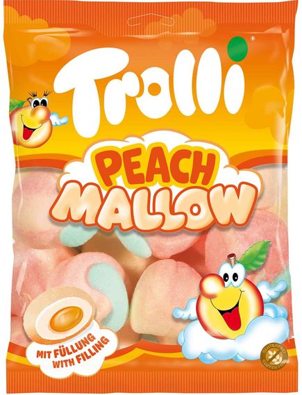 Це не може бути м'якше. Trolli Peach Mallow - це надзвичайно великі шматочки цукрової піни з інтенсивним ароматом персика та фруктовою начинкою. Форма заснована на справжніх персиках - і аромат спокусить ваші почуття. Злегка приправлені цукром, ці «м’які страви» пропонують моменти солодкого перекусу.