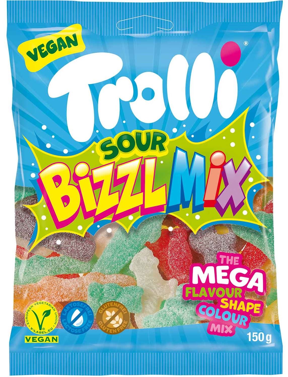 Trolli Bizzl Mix - екстра-кислий мікс з фруктовими гумками різних форм і кольорів. Поколюючі ласощі випробують ваші смакові рецептори та обов’язково змусять тремтіти кутики рота. Насолоджуйтесь моментом перекусу з фактором поколювання з цією фірмовою стравою.