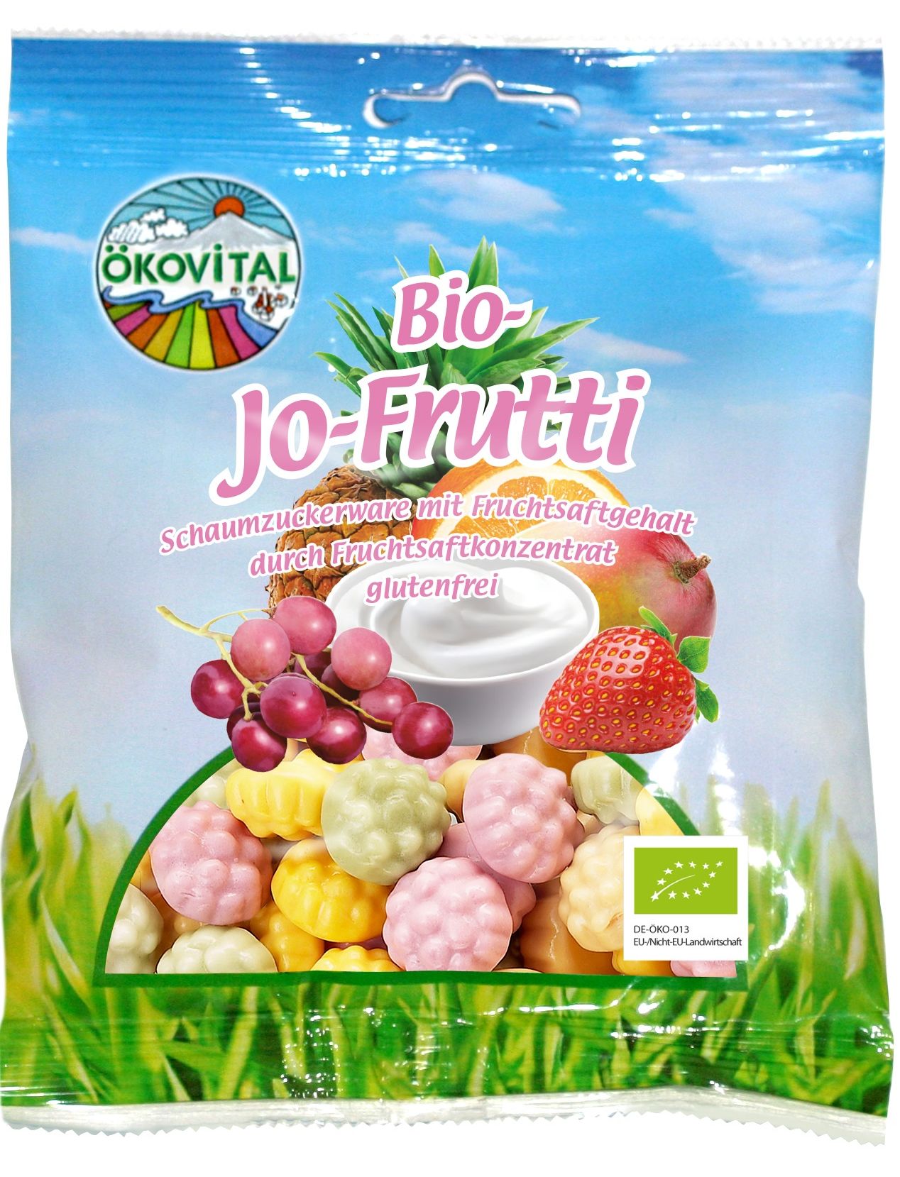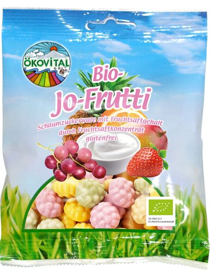 Склад: тростинний цукор* (нерафінований), глюкозний сироп*, знежирений йогурт* (5,2%), свинячий желатин*, концентрат фруктового соку* 2,52% (виноград* 1,8%, полуниця* 0,18%, ананас* 0,18%, апельсин* 0,18 %, манго* 0,18%), підкислювач (лимонна кислота), натуральні ароматизатори, гелеутворювач (пектин), барвники, фруктові та овочеві екстракти (гарбуз*, яблуко*, морква*, бузина*), покривний агент: карнаубський віск*. *Органічний інгредієнт.