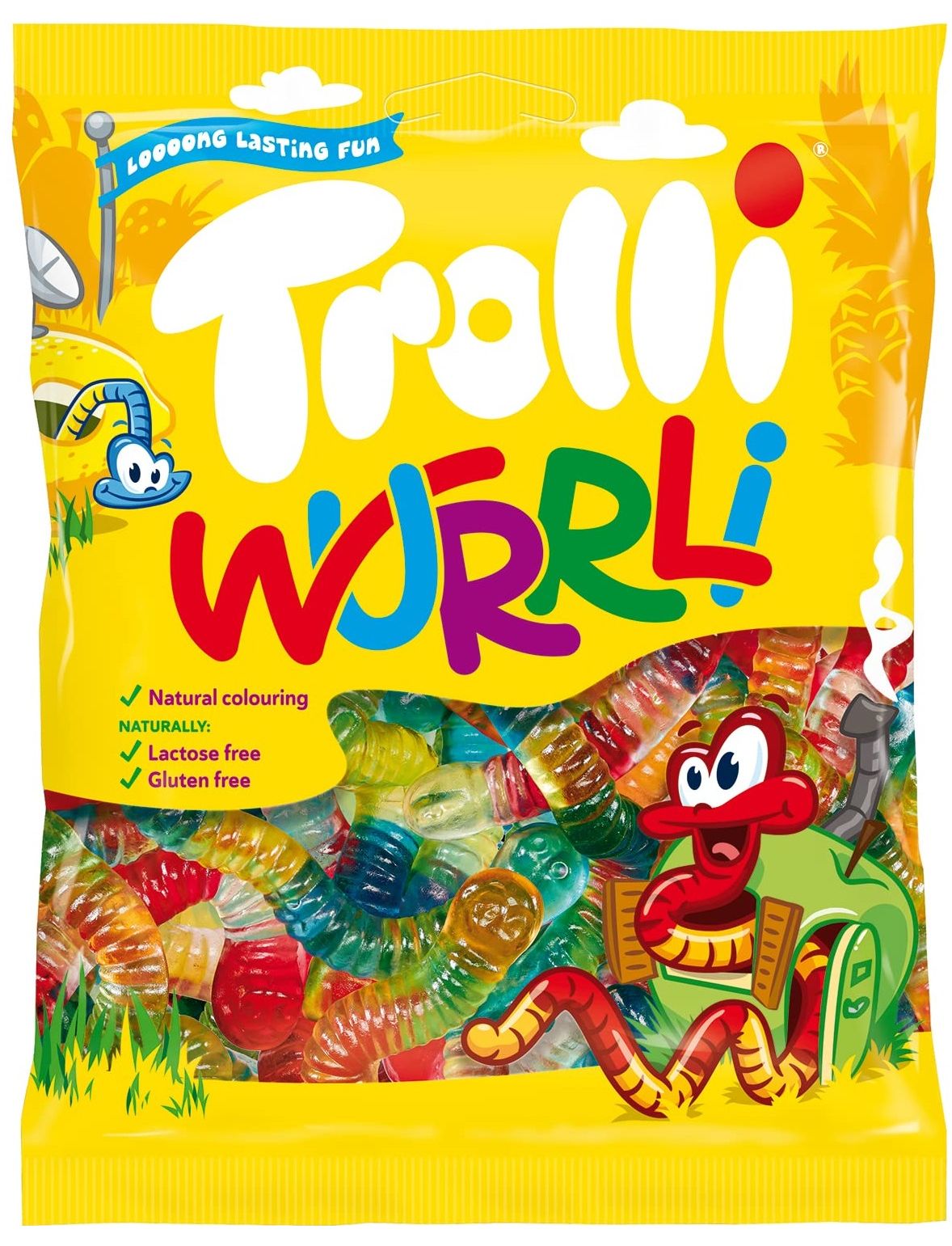 Trolli Wurrli роблять це барвисто. Черв'ячки, виготовлені зі смачної фруктової гумки, у різнокольорових версіях подарують задоволення маленьким і великим, завдяки своєму неймовірному фруктовому смаку.Накусіть черв'яків або дайте їм розтанути в роті з насолодою - веселі черв'ячки є солодкими...