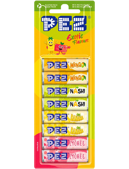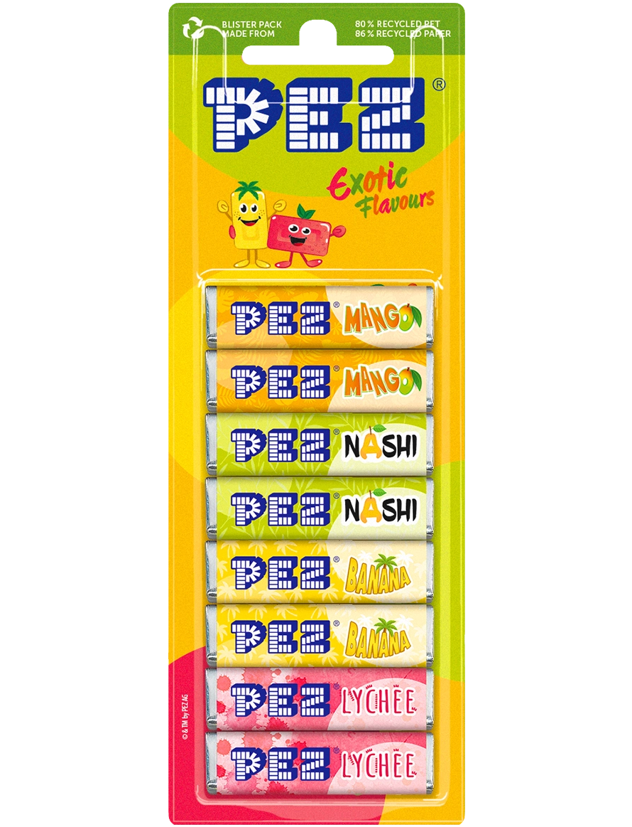 Пастилки мають форму заокругленого прямокутника та смак: вишні, полуниці, апельсина і лимона. Хімічні барвники в класичних цукерках від Pez не використовуються.