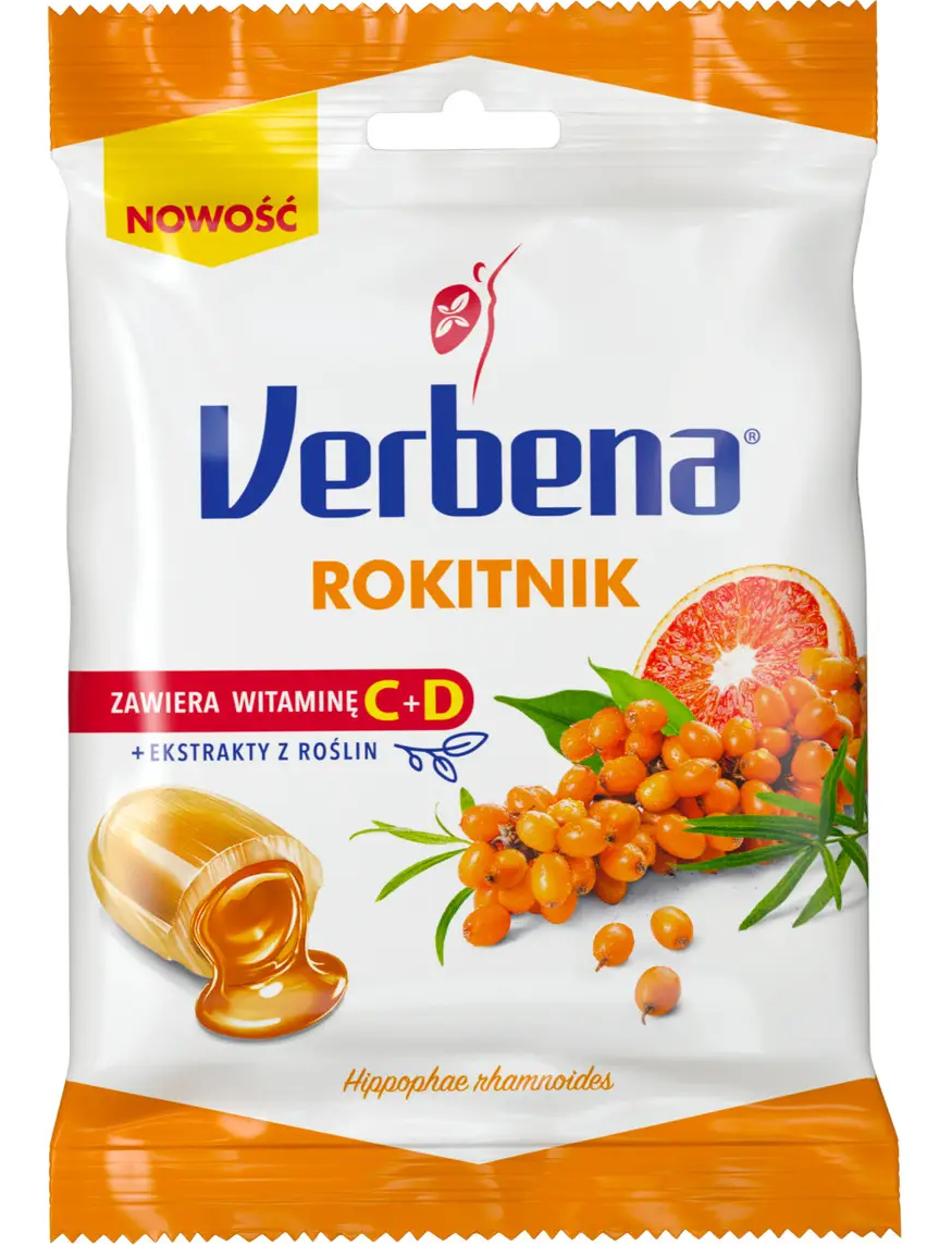 ВЕРБЕНА Обліпиха містить екстракт обліпихи та збагачена вітамінами С і D.Цукерки ВЕРБЕНА з начинкою з обліпихи, 60 г