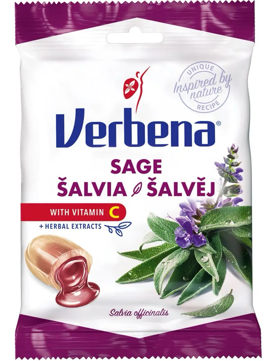 Шавлія, що міститься в цукерках VERBENA. Шавлія допомагає полегшити проблеми з диханням, такі як кашель та захворювання горла.Цукерки ВЕРБЕНА з начинкою з шавлії, 60 г