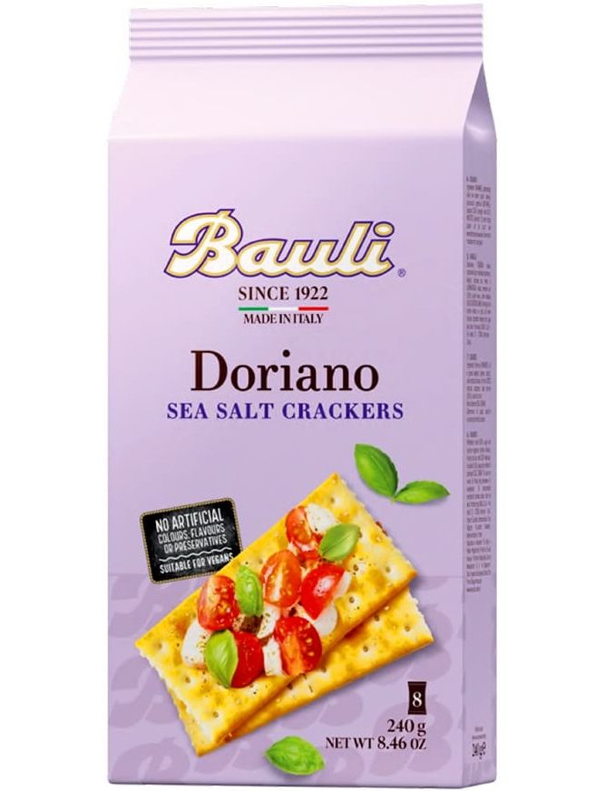 Наші класичні крекери, виготовлені із закваски, що повільно піднімається, і традиційної техніки розквашування залишаються вірними оригінальному рецепту. Золотистий і хрусткий з дрібкою солі, наш Доріано готується на вогні та повітрі для текстури та смаку «свіжого з духовки». Золотий і хрусткий з дрібкою солі