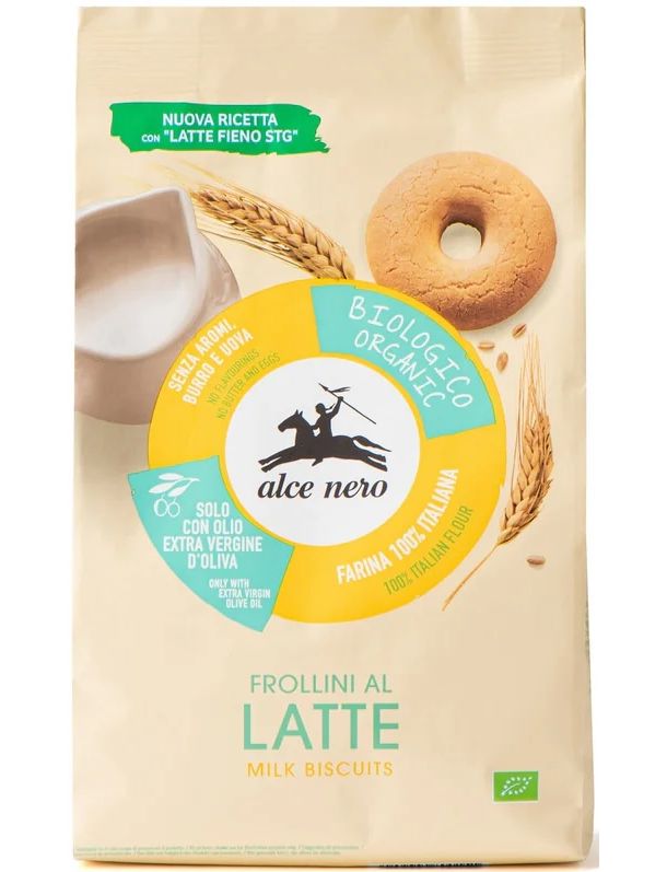 Органічне молочне печиво Alce Nero виготовляється лише з використанням оливкової олії першого віджиму та не містить яєць, ароматизаторів та тваринних жирів. Борошно виготовляється виключно з органічної пшениці, вирощеної в Італії. Органічне молочне печиво Alce Nero виготовлене на основі «Сінного молока TSG» і ідеально підходить у будь-який час доби, як для простого сніданку, так і для смачного перекусу.