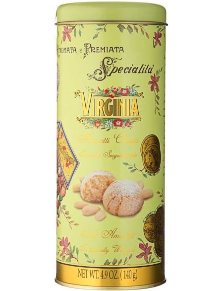 Металевий циліндр з історичною графікою Amaretti Virginia, що містить м’який мигдальний амаретті, окремо упакований у різнокольорову упаковку.