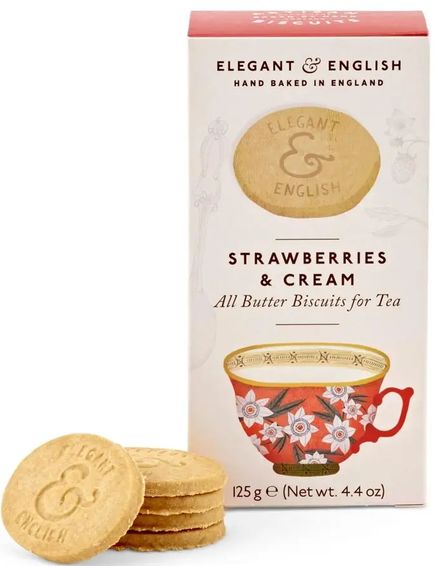 Елегантне та англійське печиво з полуницею та вершками приправлене солодким поєднанням, зробленим на небесах. Чудовий і фруктовий смак із асортименту Elegant & English, які створені як ідеальні партнери до чаю. Смак полуниці та вершків добре поєднується з чашкою Дарджилінгу.