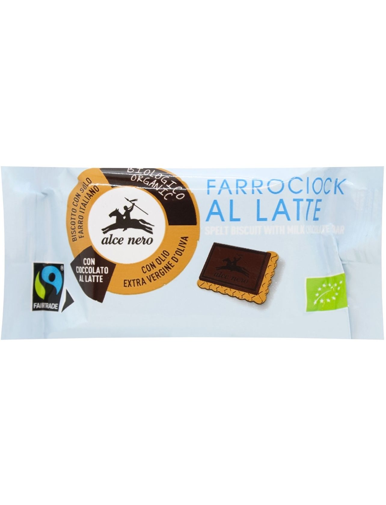 Органічне печиво зі спельтою, покрите плиткою молочного шоколаду Alce Nero, виробляється з використанням італійської спельти та органічної оливкової олії першого віджиму. Використовуване какао отримують із какао-бобів, які походять з органічного вирощування, в якому пропагуються принципи якості, здоров’я та стійкості.