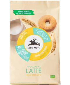 Органічне молочне печиво Alce Nero виготовляється лише з використанням оливкової олії першого віджиму та не містить яєць, ароматизаторів та тваринних жирів. Борошно виготовляється виключно з органічної пшениці, вирощеної в Італії. Органічне молочне печиво Alce Nero виготовлене на основі «Сінного молока TSG» і ідеально підходить у будь-який час доби, як для простого сніданку, так і для смачного перекусу. Склад: пшеничне борошно* (55%), тростинний цукор*, оливкова олія першого віджиму* (14%), пшеничний крохмаль*, свіже пастеризоване сінне молоко TSG* (6%)*, рисовий сироп*, сіль, розпушувачі (карбонат амонію, карбонат натрію)).*Органічний інгредієнт.
