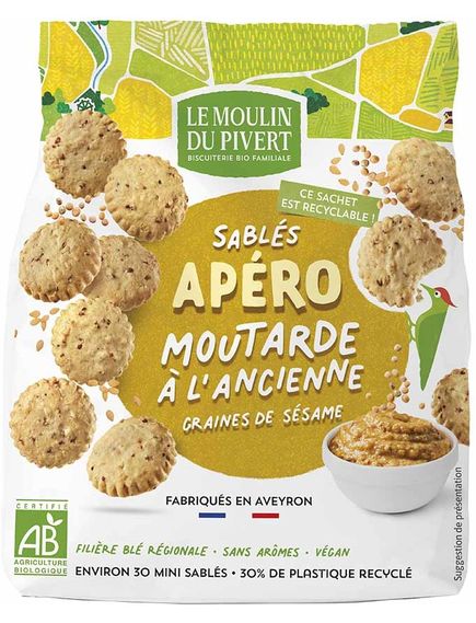 Склад: пшеничне борошно* T65 (69%), гірчиця старомодна * (20%) (вода, насіння гірчиці *, спиртовий оцет *, сіль), соняшникова олія *, зневоднений нерафінований пшеничний сироп *, насіння кунжуту * (2,4%), морська сіль, розпушувач: карбонат натрію.