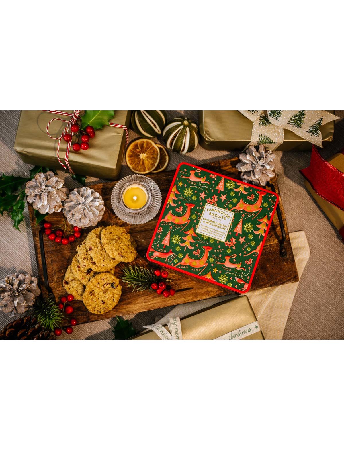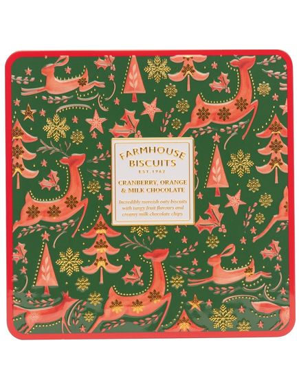 Вівсяне печиво з пікантним смаком журавлини та апельсина, поєднане з вершковими крихтами молочного шоколаду, все це упаковано у святкову червоно-зелено-золоту різдвяну дизайнерську бляшанку.