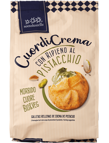 Склад: борошно з м’якої пшениці *, фісташковий крем * (тростинний цукор*, інулін*, високоолеїнова соняшникова олія*, фісташкова паста * 15%, емульгатор: соняшниковий лецитин*; натуральний ароматизатор ванілі, сіль), рослинний маргарин* (соняшникова олія*, масло ши*, вода, натуральний ароматизатор зеленого чаю), тростинний цукор*, рисовий солод* (рисове борошно). *, солод ячмінний *), карбонати натрію, емульгатор: лецитини соняшнику*. *органічні інгредієнти