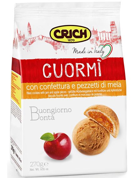 Склад: борошно пшеничне, яблучний джем 28,3% (яблучні кубики -66г на 100г джему-, інвертований цукровий сироп, яблучне пюре -33г на 100г джему-, цукор, сік лимонний концентрований, гелеутворювач: пектин, підкислювач: лимонна кислота), пальма олія, цукор, ЯЙЦЯ , МОЛОКО сухе знежирене , сироп фруктози, розпушувачі: натрію гідрокарбонат, амонію гідрокарбонат, монокалію тартрат; емульгатор: соєвий лецитин , сіль, ароматизатори, кориця.