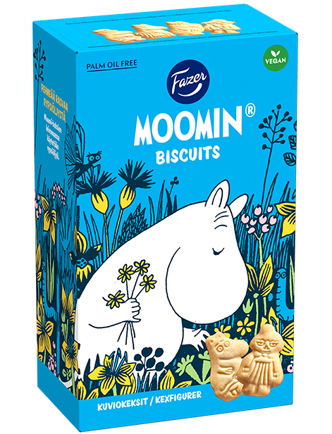 Маленькі та хрусткі печивка «Мумі-тролі» – це ласощі для всієї родини. Це ніжне печиво фінського виробництва не містить пальмової олії та також підходить для веганів. Веселе печиво «Мумі-тролі» – це чудовий подарунок, частування на день народження або перекус.