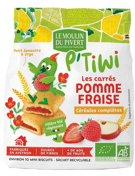 Здоровіший та смачніший органічний перекус – це можливо! Відкрийте для себе ці м’які цільнозернові квадратики, наповнені фруктовим пюре, які так люблять діти. Ідеально підходять як для маленьких, так і для великих ласунів! Це органічне печиво містить понад 60% фруктів, включаючи яблучне та полуничне пюре. Солодке та пікантне, воно користується популярністю як у дітей, так і у батьків! Крім того, воно виготовлене з цільного зерна, яке є гарним джерелом клітковини: однозернової пшениці (відомої своїм низьким вмістом глютену) та ячменю.