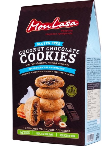 Склад: олія кокосова холодного віджиму, мед натуральний, борошно жорнового помелу рисове, борошно кокосове, кокосове сухе молоко, масло гірчичне холодного віджиму, кокосова стружка, крохмаль кукурудзяний, натуральний екстракт ванілі, сіль морська, сода харчова.