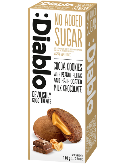 Смачне печиво з какао, начинене арахісовим кремом і наполовину занурене в шоколад. Без додавання цукру та підсолоджений природними ароматизаторами мальтиту.