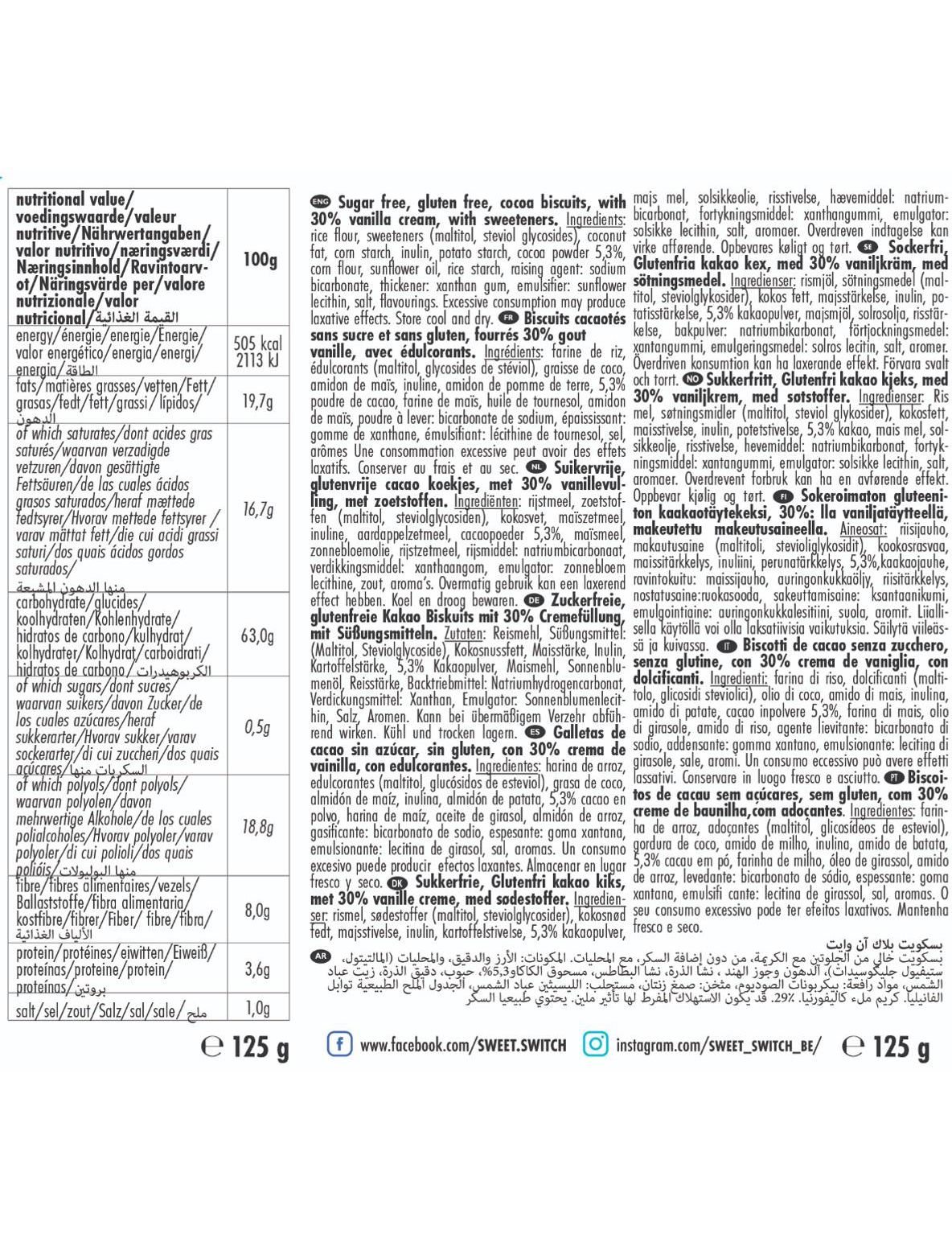Склад: рисове борошно, підсолоджувачі (мальтит, стевіол глікозиди), кокосове масло, кукурудзяний крохмаль, картопляний крохмаль, какао-порошок 5,3%, кукурудзяне борошно, соняшникова олія, розпушувач: бікарбонат натрію, загусник: ксантанова камедь, емульгатор: соняшниковий лецитин, сіль, ароматизатори.