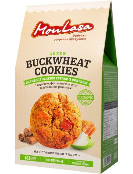 Підвищує імунітет та сприяє схудненню. Запашне печиво з цейлонською корицею, цільнозерновим борошном органічної зеленої гречки жорнового помелу, з додаванням шматочків яблук, фініками та натуральним медом, гірчичною олією холодного пресування.