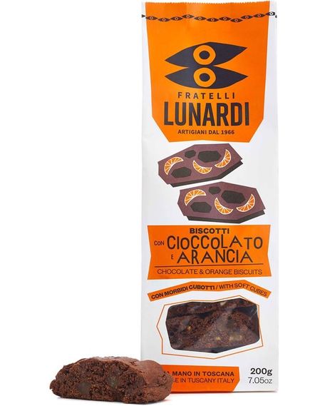 Ніжні кантуччі з 25% шоколаду та м'якими кубиками цукатів італійського апельсина.