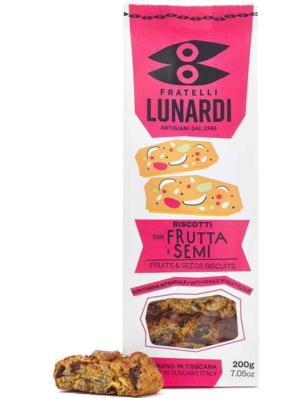 Склад: мюслі 27% (фрукти 95% у змінних пропорціях: родзинки, дегідратована журавлина США, дегідратовані абрикоси, кокос; вівсяні пластівці), тростинний цукор, тосканське пшеничне борошно типу 0, насіння 11% у змінних пропорціях (насіння гарбуза, насіння соняшнику) , яйця, цільнозернове борошно 6%, вершкове масло (молоко), італійський мед, розпушувач (гідрокарбонат натрію, винний камінь, кукурудзяний крохмаль, бікарбонат амонію), морська сіль, інвертний цукор, глюкоза, бікарбонат амонію, спеції. Може містити горіхи, арахіс, кунжут і гірчицю. Без консервантів і барвників. Зберігати в прохолодному та сухому місці.