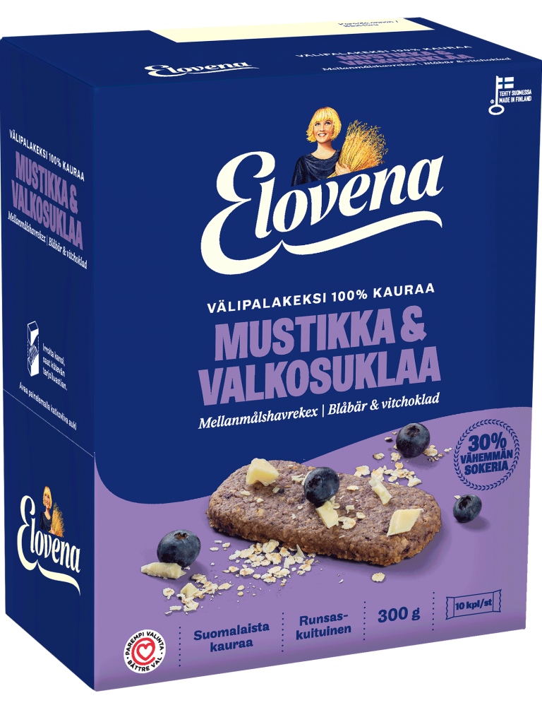 Смачне печиво Elovena з чорницею та білим шоколадом має смак свіжої чорниці та солодкого білого шоколаду. Зерно цільнозернового печива складається з 100% вівса і випікається на ріпаковій олії. Печиво з високим вмістом клітковини містить в середньому на 30% менше цукру, ніж закусочне печиво. В упаковці 10 печива в індивідуальній упаковці, які можна легко взяти з собою на хобі, в школу або на роботу. Продукт виготовлений у Фінляндії з фінського вівса. Sydänmerkki, присвоєний продукту, означає, що він є більш здоровим вибором у власній групі продуктів.
