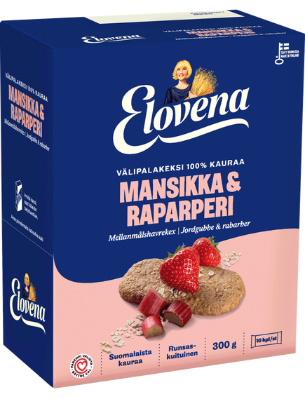 Смачна закуска Elovena Strawberry & Rhubarb містить гострий ревінь і солодкі шматочки полуниці. Зерно цільнозернового печива складається з 100% вівса і випікається на ріпаковій олії. Печиво з високим вмістом клітковини отримало нагороду Heart Label. Зручне індивідуально упаковане печиво легко взяти з собою та насолоджуватися ним, коли вам потрібно більше енергії у смачній формі. Продукт виготовлений у Фінляндії з фінського вівса.