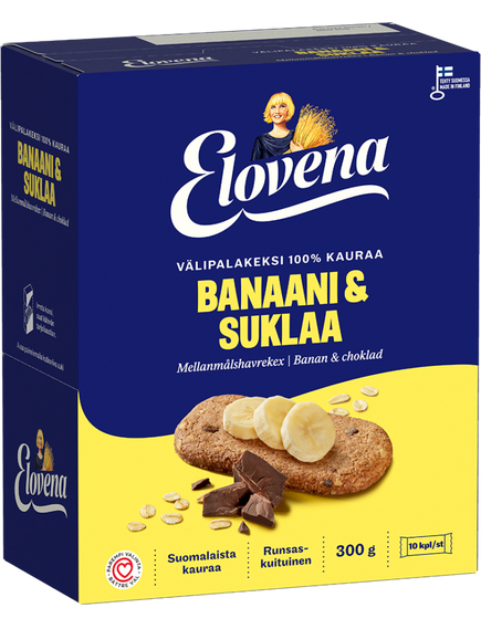 Закусочне печиво Elovena Banana&chocolate поєднує в собі класичне поєднання банана та чорного шоколаду. Зерно цільнозернового печива складається з 100% вівса, а у випічці використовується рапсова олія. Печиво з високим вмістом клітковини було нагороджено знаком серця Фінської кардіологічної асоціації. Зручне, індивідуально упаковане печиво легко взяти з собою та насолоджуватися, коли вам потрібна енергія у смачній формі. Продукт виготовлений у Фінляндії з фінського вівса.