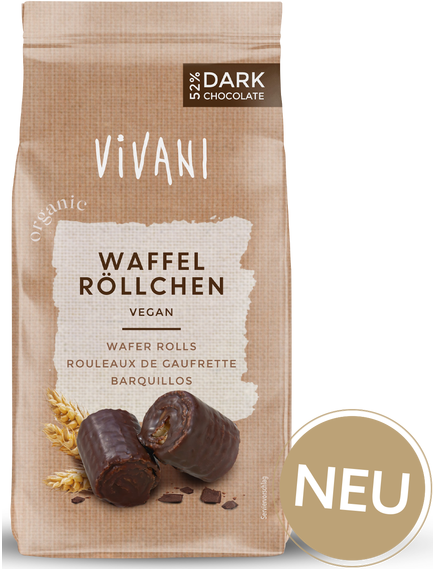 Перший варіант випічки від VIVANI: хрусткі вафельні трубочки в пишній глазурі з чорного шоколаду. Насичений вміст шоколаду 52% змушує серця всіх шанувальників шоколаду битися швидше.