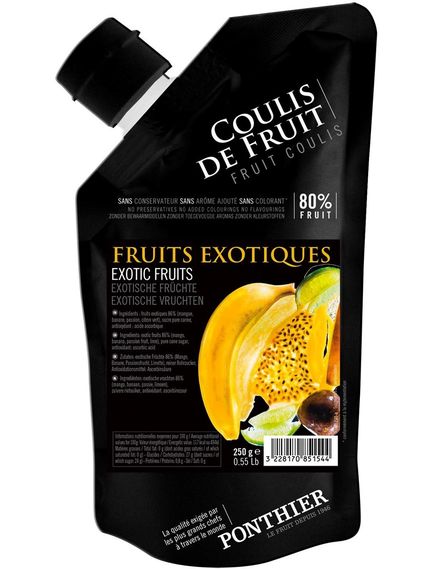Щоб приготувати своє екзотичне фруктове пюре та кулі, Maison Ponthier поєднує 4 ретельно відібрані фрукти: чистий маракуйя з Еквадору, манго Альфонсо з чистої Індії (Ратнагірі), чистий банан з Еквадору та чистий зелений лимон з Мексики. У цьому рецепті ми знаходимо смакові якості кожного фрукта: гострий смак маракуйї, кремовий смак манго, вишуканий аромат банана, і все це підсилюється кислинкою лайма.