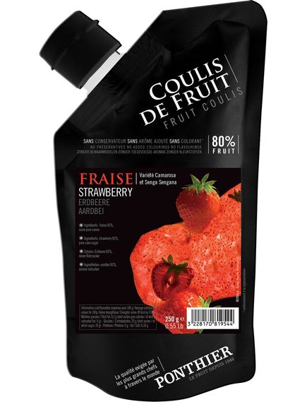Maison Ponthier пропонує полуничне пюре з поєднанням сортів Camarosa і Mara des Bois. Полуниця Mara des Bois, відібрана Maison Ponthier, вирощена в Марокко та Франції, привносить фруктові, деревні нотки та збагачує ароматний профіль пюре. Він має прекрасний аромат, а також свіжий, круглий і чудовий смак, зокрема завдяки видаленню сім’янок під час процесу виробництва. Світло-червоний колір, його текстура ідеально гладка та однорідна, вірна м’ясистому вигляду свіжих фруктів.
