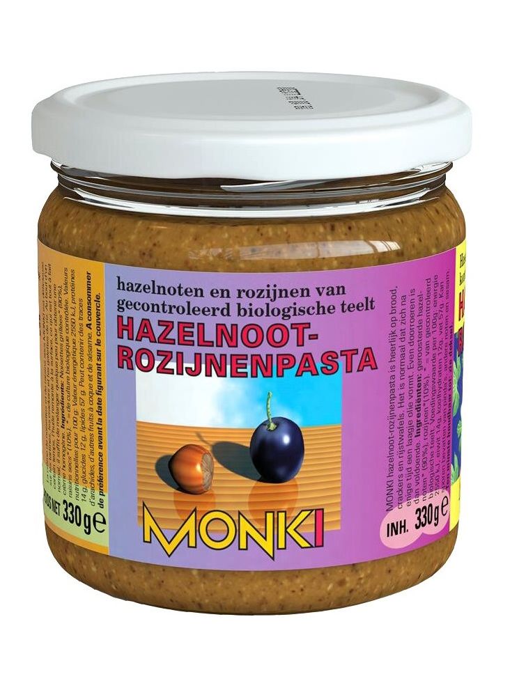 Масло з родзинками MONKI чудово підходить для хліба, крекерів і рисових коржів. Це нормально, якщо через деякий час утворюється масляна плівка. Тоді достатньо перемішування. Склад: фундук смажений*(89%), родзинки*(11%). *= з контрольованого органічного вирощування. Може містити сліди арахісу, інших горіхів і кунжуту. Попередження: незважаючи на всю турботу, у виняткових випадках ви можете знайти шматочок кори.