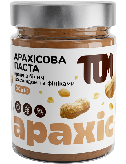 Склад: смажений арахіс (80%), фініки сушені подрібнені, білий шоколад, шматочки арахісу смаженого.