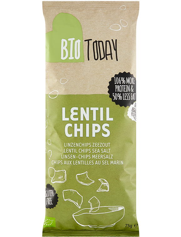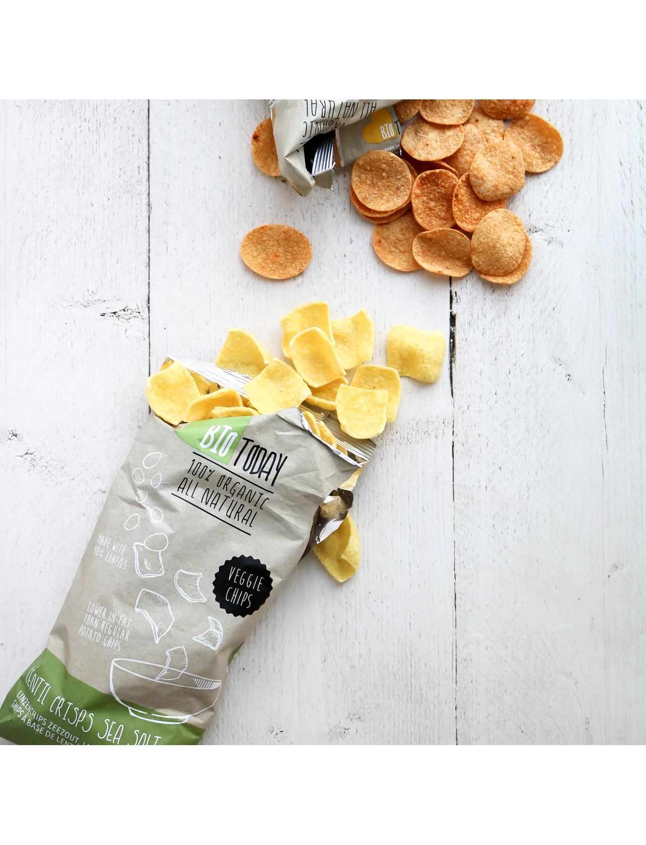 Безглютеновые чипсы BioToday с чечевицей. Момент перекуса перед телевизором, где вы можете сказать, что делаете все возможное! Хрустящий кусочек дает тонкое вкусовое ощущение красной чечевицы с морской солью без искусственных добавок и на 50% меньше жира, чем обычные чипсы.