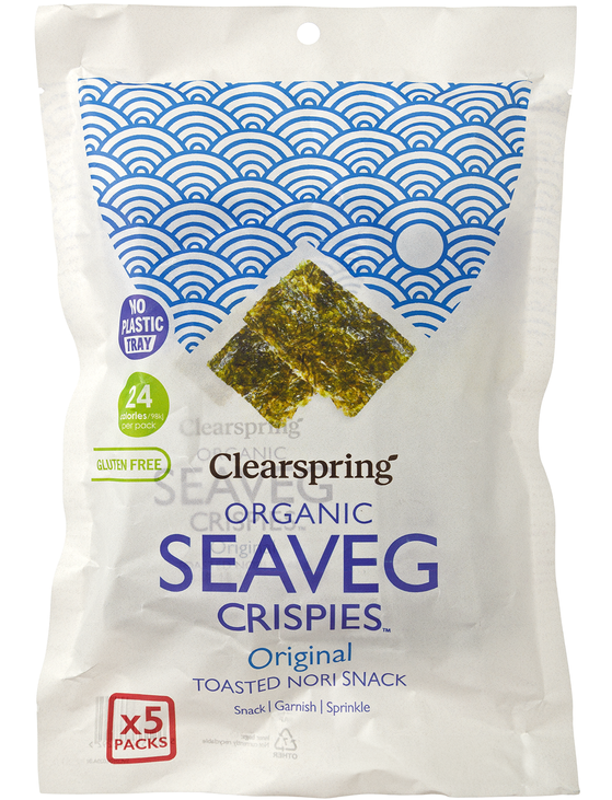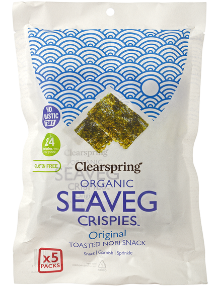 Clearspring Organic Seaveg Crispies — це чудова закуска з морських водоростей, смаження нашого органічного норі протягом кількох секунд додає виразної хрусткості цьому унікальному смаку умамі моря. Легке присипання морською сіллю перетворить цей популярний морський овоч на зручну та смачну закуску для вашої родини. Так само чудово підходить для прикраси рамен, рису або просто посипання салатів.