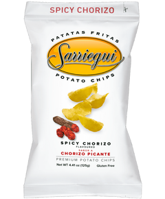 Склад: картопля, оливкова олія першого віджиму, соняшникова олія, ароматизатор чорізо (5%) (мальтодекстрин, перець, підсилювачі смаку (E621, E627, E631), цибульний порошок, часниковий порошок), сіль. Продукт не містить алергенів. Без глютену.