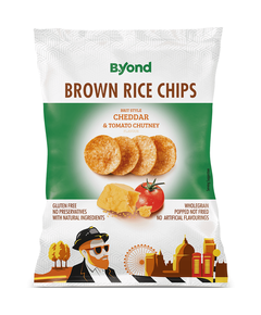 B.Yond - Болгария. Рисовые чипсы со вкусом британского сыра Чеддер и томатного соуса-чатни. Созданы на основе цельного коричневого риса, специй и других ингредиентов. Обладают хрустящей текстурой и мягким сырным вкусом с легкими томатными нотками. Идеально сочетаются с разнообразными соусами и сальсой, а также прохладительными напитками. Чипсы B.Yond станут вариантом закуски во время просмотра любимого фильма, вечеринки с настольными играми, большого праздника с друзьями, или туристической поездки. Продукт является надежным источником клетчатки. 100 г = 418 ккал. Представлен в удобной упаковке. Вес продукта - 70 г.