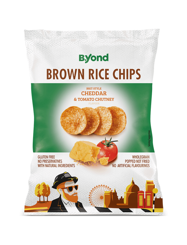 B.Yond - Болгария. Рисовые чипсы со вкусом британского сыра Чеддер и томатного соуса-чатни. Созданы на основе цельного коричневого риса, специй и других ингредиентов. Обладают хрустящей текстурой и мягким сырным вкусом с легкими томатными нотками. Идеально сочетаются с разнообразными соусами и сальсой, а также прохладительными напитками. Чипсы B.Yond станут вариантом закуски во время просмотра любимого фильма, вечеринки с настольными играми, большого праздника с друзьями, или туристической поездки. Продукт является надежным источником клетчатки. 100 г = 418 ккал. Представлен в удобной упаковке. Вес продукта - 70 г.
