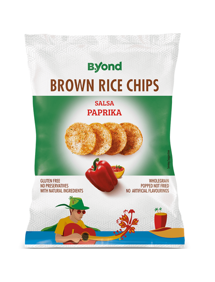 B.Yond - Болгария. Рисовые чипсы со вкусом латиноамериканской сальсы с паприкой. Созданы на основе цельного коричневого риса, специй и других ингредиентов. Обладают хрустящей текстурой и мягким вкусом с легкими пряными нотками. Идеально сочетаются с разнообразными соусами и сальсой, а также прохладительными напитками. Чипсы B.Yond станут вариантом закуски во время просмотра любимого фильма, вечеринки с настольными играми, большого праздника с друзьями, или туристической поездки. Продукт является надежным источником клетчатки. 100 г = 418 ккал. Представлен в удобной упаковке. Вес продукта - 70 г.