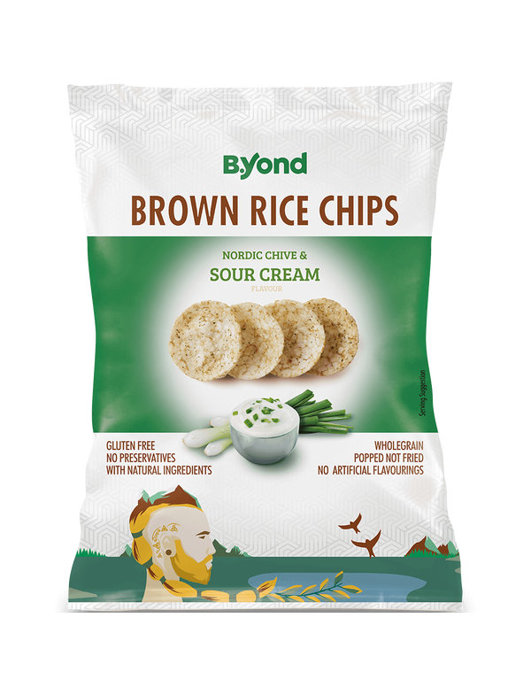 B.Yond - Болгария. Рисовые чипсы со вкусом сметаны и лука. Созданы на основе цельного коричневого риса, специй и других ингредиентов. Обладают хрустящей текстурой и мягким вкусом с легкими пикантными нотками. Идеально сочетаются с разнообразными соусами и сальсой, а также прохладительными напитками. Чипсы B.Yond станут вариантом закуски во время просмотра любимого фильма, вечеринки с настольными играми, большого праздника с друзьями, или туристической поездки. Продукт является надежным источником клетчатки. 100 г = 418 ккал. Представлен в удобной упаковке. Вес продукта - 70 г.