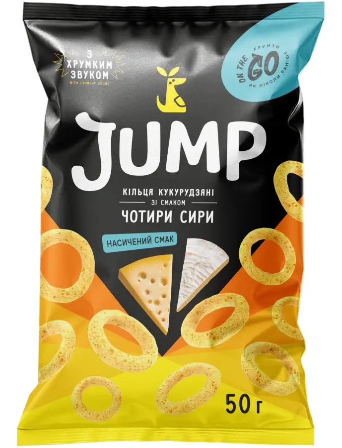 Склад: кільця кукурудзяні 74% ( крупа кукурудзяна, сіль кухонна, олія соняшникова, емульгатор соєвий лецитин) олія соняшникова високоолеїнова рафінована дезодорована виморожена з антиоксидантом Е 306, суміш смакова «чотири сири». Може містити сліди злаків, що містять глютен, арахісу, горіхів та молочних продуктів.