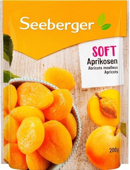 М'які абрикоси Seeberger висушені особливим способом, зберігають м'якість і соковитість і повністю виправдовують свою назву. Делікатний спосіб відновлення повертає природний, тонкий і фруктовий смак у кожен шматочок. Завдяки герметичній упаковці, абрикоси зберігають свій ніжний смак і м'яку оболонку.