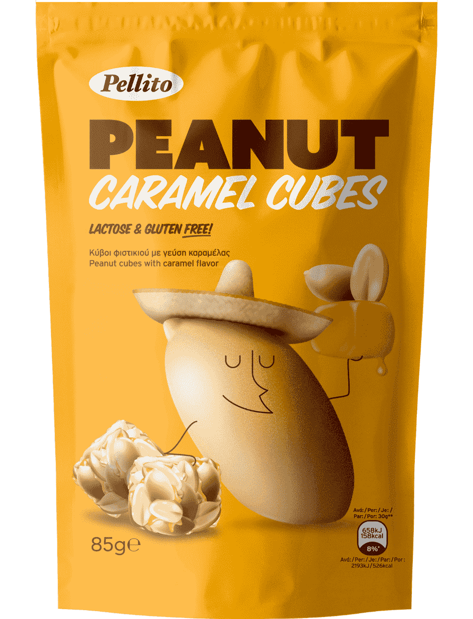 Склад: арахіс 62%, сироп глюкози, цукор, мед, сіль морська, ароматизатор (містить ароматизатор карамель 0,15% та ароматизатор ваніль), барвник (сульфітно-аміачна карамель).