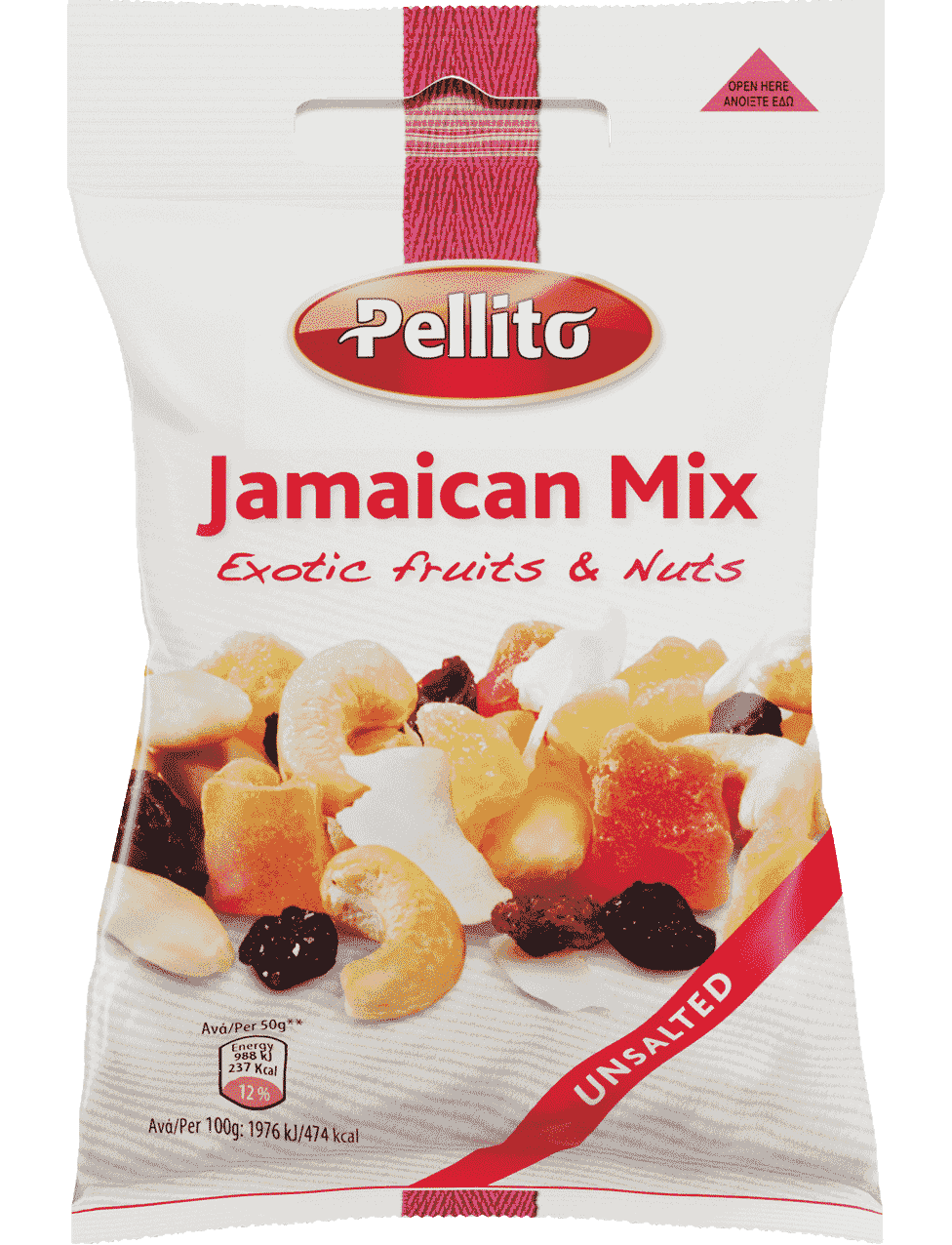 Склад: горіхи 40% (сирий бланшований мигдаль, злегка обсмажений кешью) у змінних пропорціях, підсолоджені та сушені екзотичні фрукти 60% [родзинки (чорні родзинки та соняшникова олія), папайя (папайя, цукор, консервант: метабісульфіт натрію), ананас (ананас) , цукор, регулятор кислотності: лимонна кислота, консервант: метабісульфіт натрію), манго (манго, цукор, підсилювач смаку: кислота лимонна, консервант: метабісульфіт натрію), кокосова стружка] у змінних пропорціях.