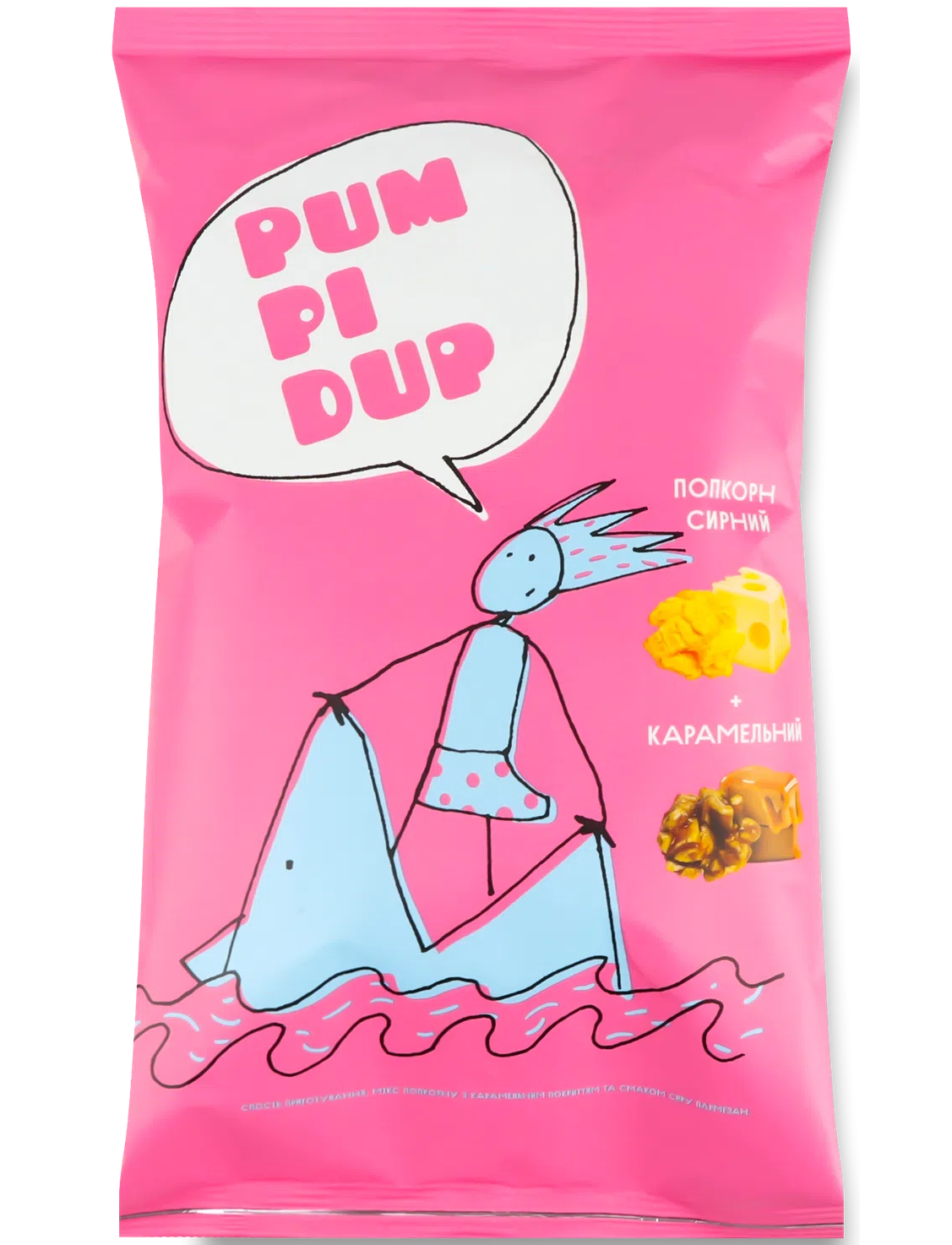 Склад: зерно кукурудзи для виготовлення попкорну, олія соняшникова, сіль морська, карамельне покриття (цукор, патока кукурудзяна суха, екстракти рослинні частково гідрогенізовані, сіль кухонна, натуральні ароматизатори, ароматизатори, барвник цукровий колер, добавка, що перешкоджає злежуванню та грудкуванню двоокис кремнію), суміш смако-ароматична сир пармезан (сироватка молочна суха, сіль кухонна "екстра", цукор, підсилювачі смаку та аромату: глутамат натрію, риботайд, декстроза моногідрат, ароматичні компоненти, натуральні ароматичні речовини, регулятори кислотності: лимонна кислота, диацетат натрію, натуральний барвник паприки екстракт, добавка, що перешкоджає злежуванню та грудкуванню двоокис кремнію).