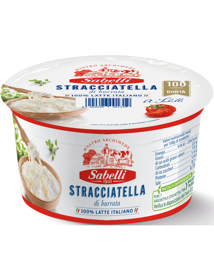 Stracciatella Sabelli: вершкове серце Burrata Sabelli, що складається з дуже свіжих вершків у поєднанні з вишуканими шматочками моцарелли, готове на підносі, щоб насолоджуватися ним лише у найвишуканіших приготуваннях.