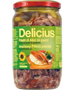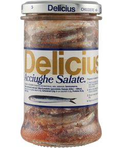 Склад: анчоуси, сіль, розсіл (вода, сіль). Справжні традиційні консервовані анчоуси: відпочивають у бочках під шарами морської солі, дозрівають місяцями, а потім зберігаються в скляних банках для справжніх любителів найбільш класичних приготувань. Солоні анчоуси Delicius — це...